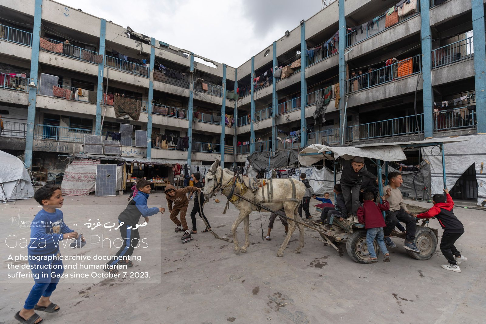 In this album, we document the features of life inside schools and displacement camps in Gaza. Classrooms turned into sleeping quarters, and tents set up in schoolyards — all details that reflect the life of people in displacement. These photographs show how families try to adapt to harsh conditions, between searching for food and water and living in overcrowded spaces.