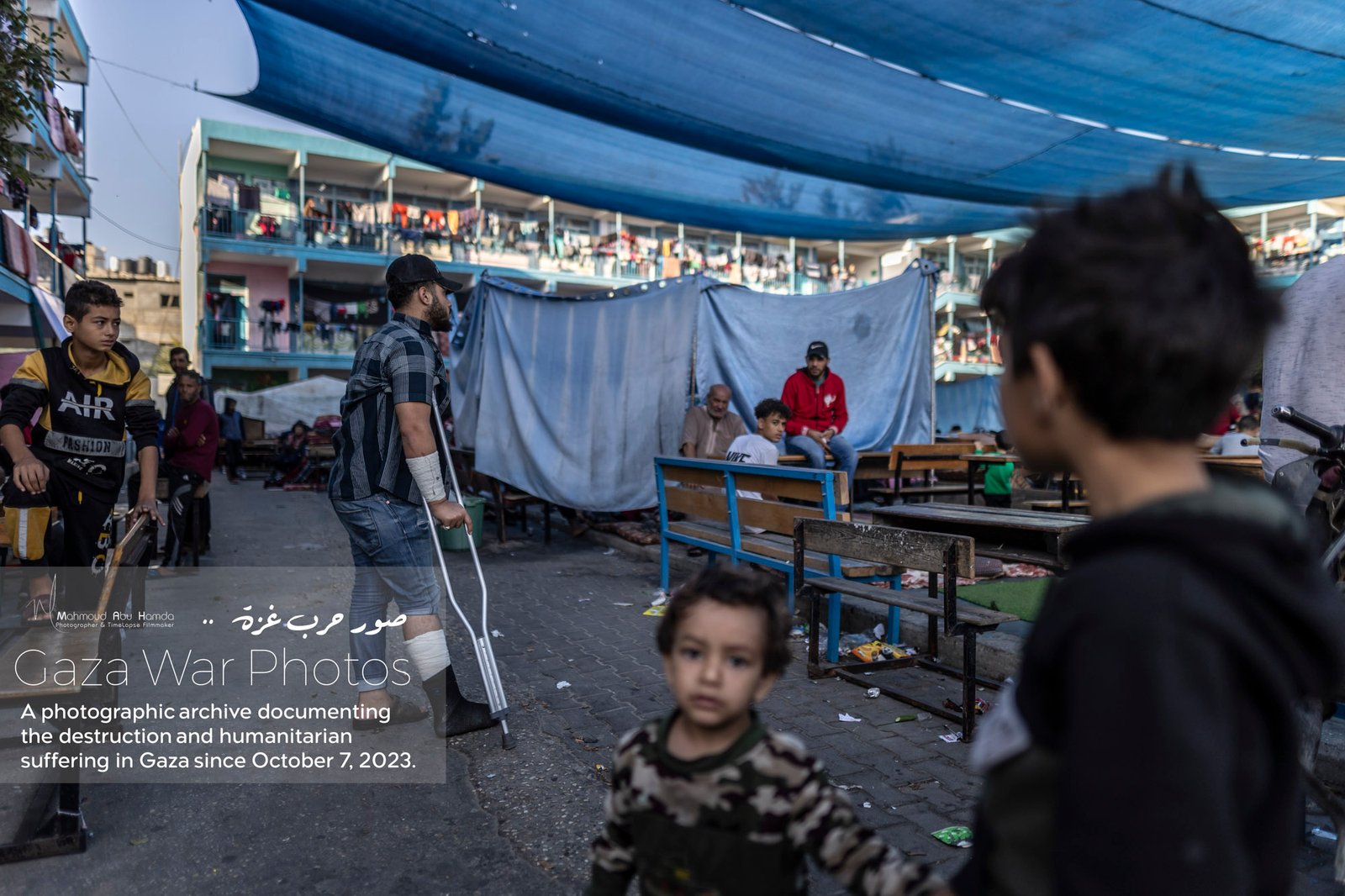 In this album, we document the features of life inside schools and displacement camps in Gaza. Classrooms turned into sleeping quarters, and tents set up in schoolyards — all details that reflect the life of people in displacement. These photographs show how families try to adapt to harsh conditions, between searching for food and water and living in overcrowded spaces.