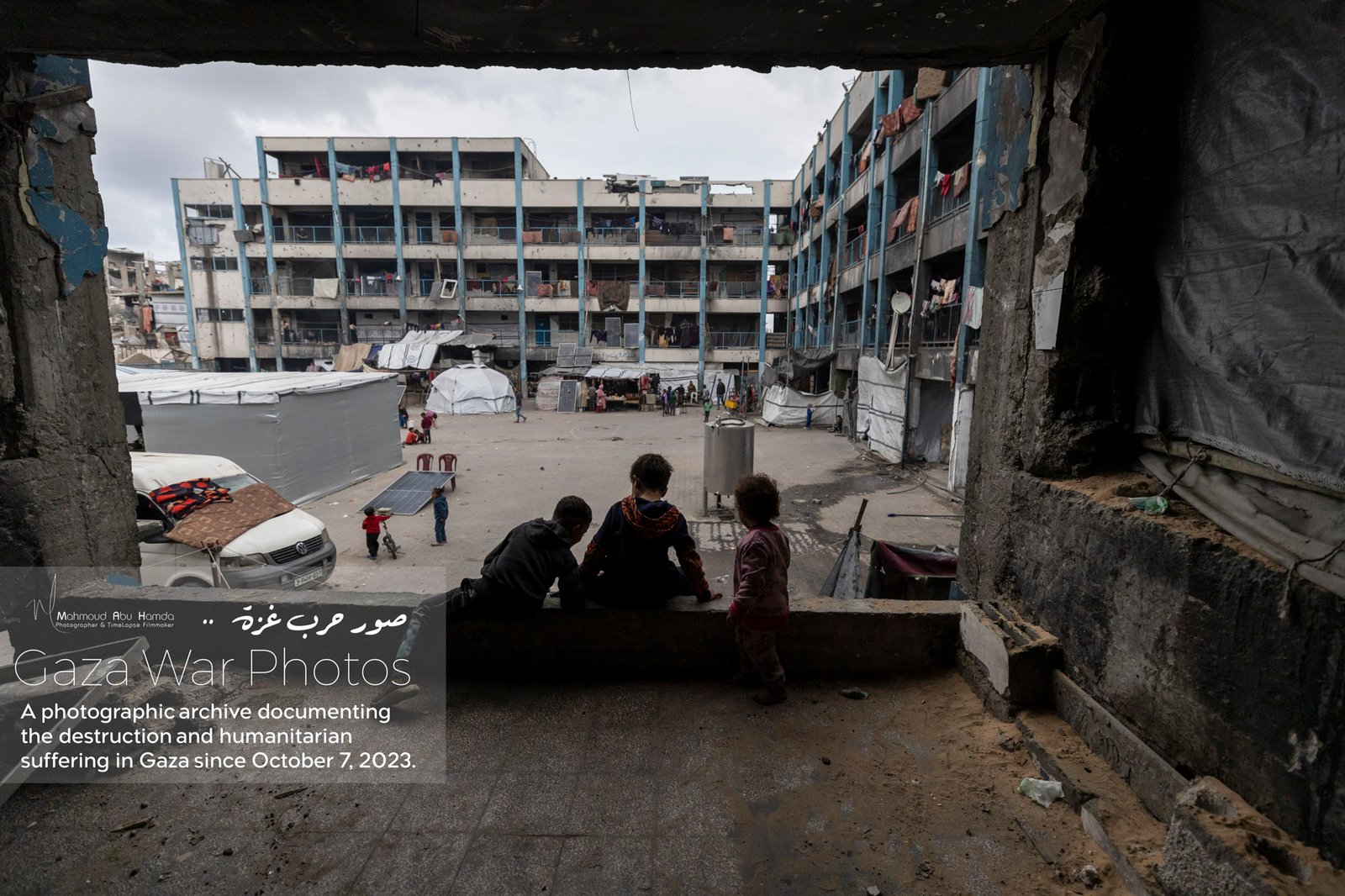 In this album, we document the features of life inside schools and displacement camps in Gaza. Classrooms turned into sleeping quarters, and tents set up in schoolyards — all details that reflect the life of people in displacement. These photographs show how families try to adapt to harsh conditions, between searching for food and water and living in overcrowded spaces.
