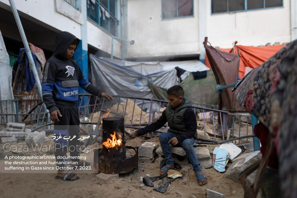 In this album, we document the features of life inside schools and displacement camps in Gaza. Classrooms turned into sleeping quarters, and tents set up in schoolyards — all details that reflect the life of people in displacement. These photographs show how families try to adapt to harsh conditions, between searching for food and water and living in overcrowded spaces.