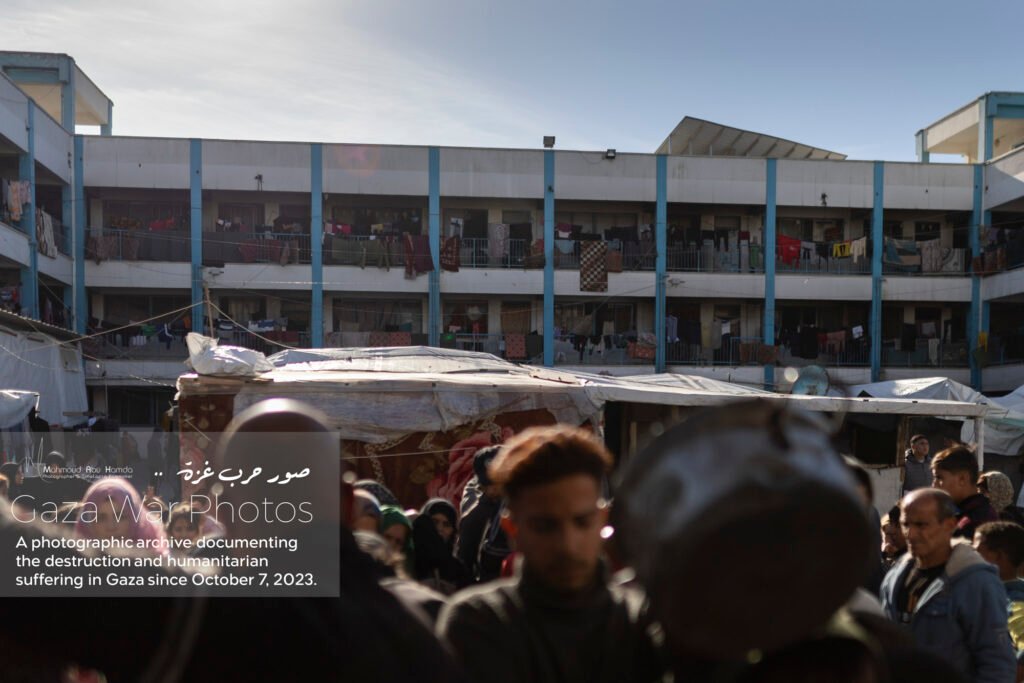 In this album, we document the features of life inside schools and displacement camps in Gaza. Classrooms turned into sleeping quarters, and tents set up in schoolyards — all details that reflect the life of people in displacement. These photographs show how families try to adapt to harsh conditions, between searching for food and water and living in overcrowded spaces.