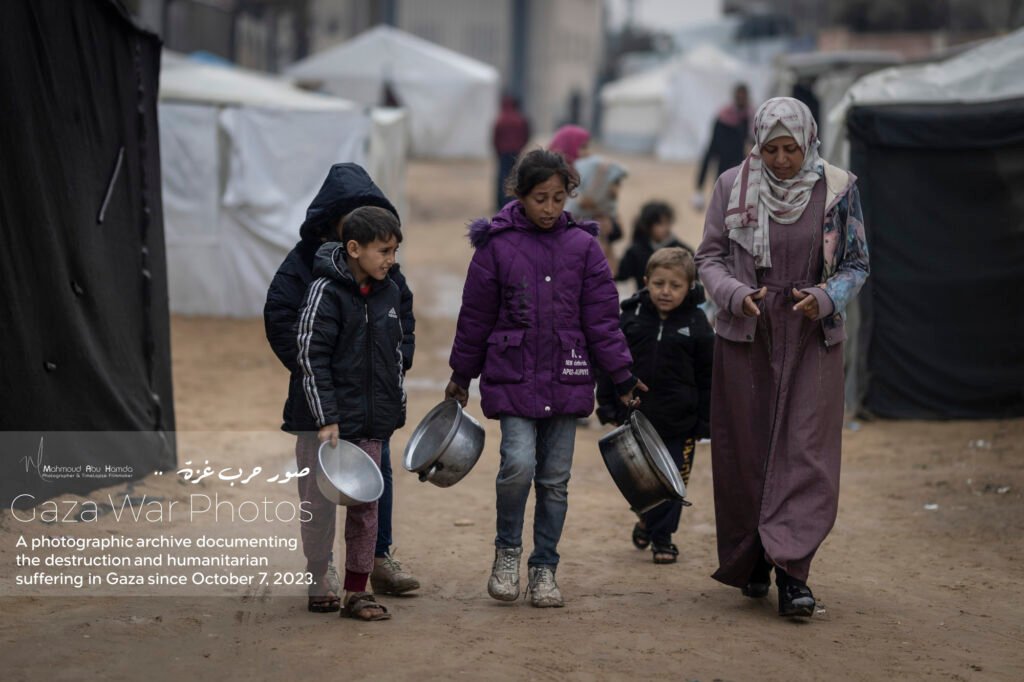 In the album “Struggle for Water”, we depict the daily struggle of Gazans in their search for clean water. Long lines form around distribution points, with children and women carrying containers while waiting for their turn to secure a drop of water. The sight of people searching for water amid destruction and temporary camps reflects the immense difficulties of daily life.