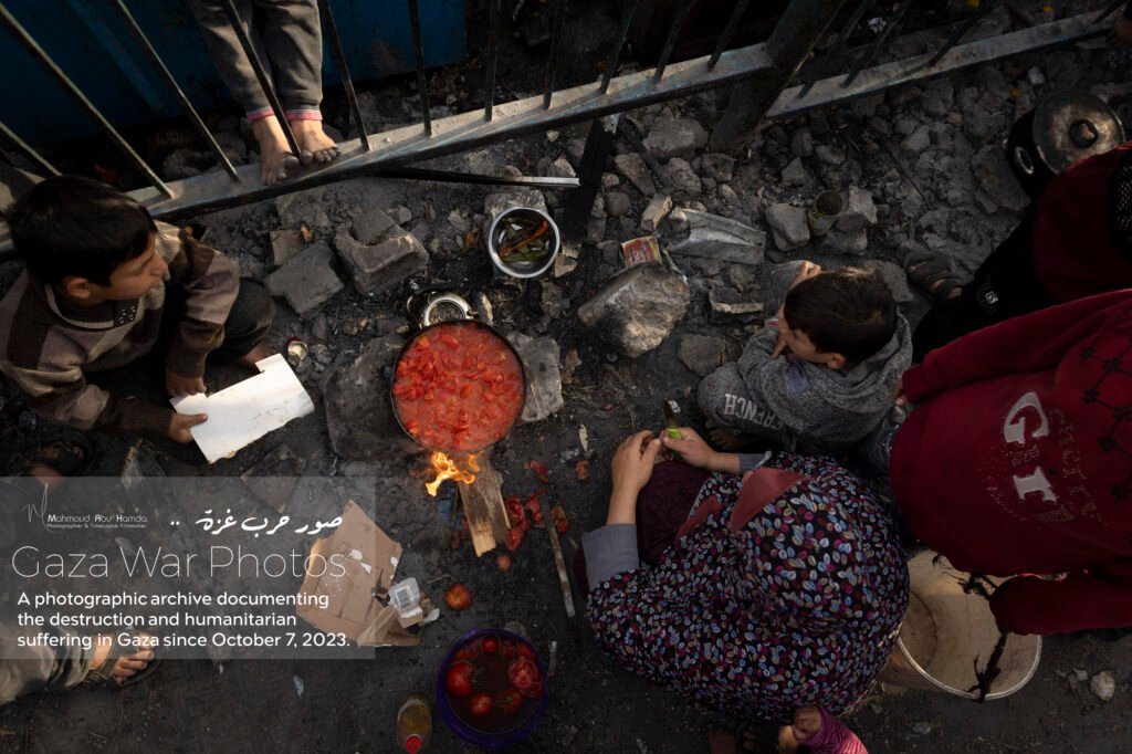 In the album “Struggle for Food”, we paint an image of the suffering of women and children standing in long lines to obtain food. Here, in the tents or displacement schools, the very act of preparing meals becomes a struggle in itself due to the lack of cooking gas and the difficulty of securing essentials.