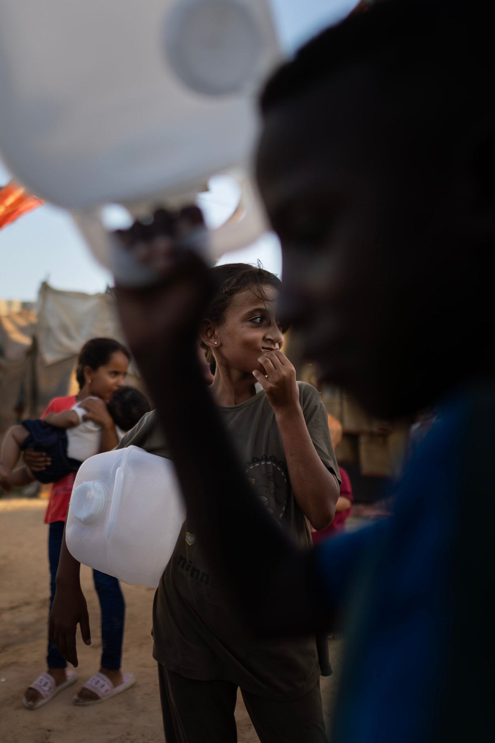 In the album “Struggle for Water”, we depict the daily struggle of Gazans in their search for clean water. Long lines form around distribution points, with children and women carrying containers while waiting for their turn to secure a drop of water. The sight of people searching for water amid destruction and temporary camps reflects the immense difficulties of daily life.