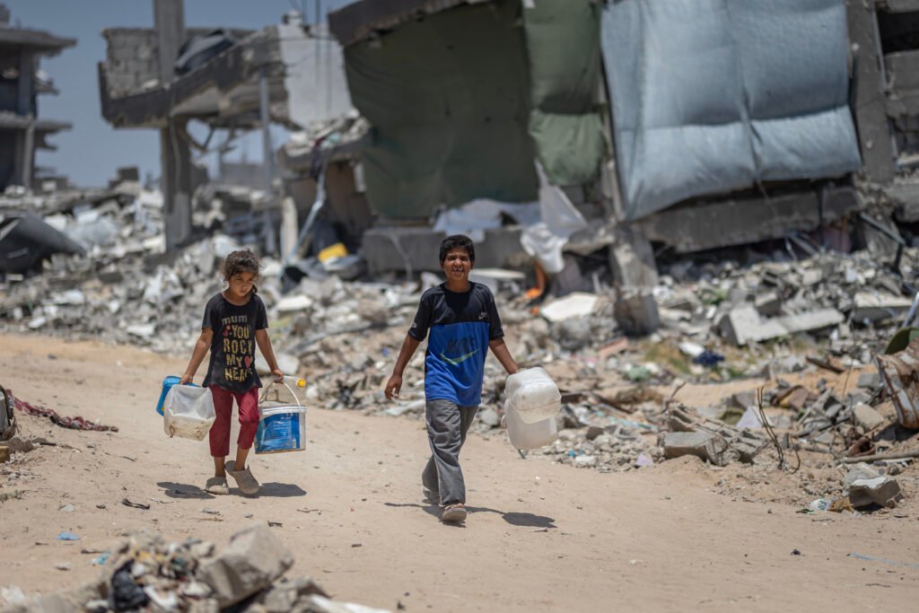 In the album “Struggle for Water”, we depict the daily struggle of Gazans in their search for clean water. Long lines form around distribution points, with children and women carrying containers while waiting for their turn to secure a drop of water. The sight of people searching for water amid destruction and temporary camps reflects the immense difficulties of daily life.