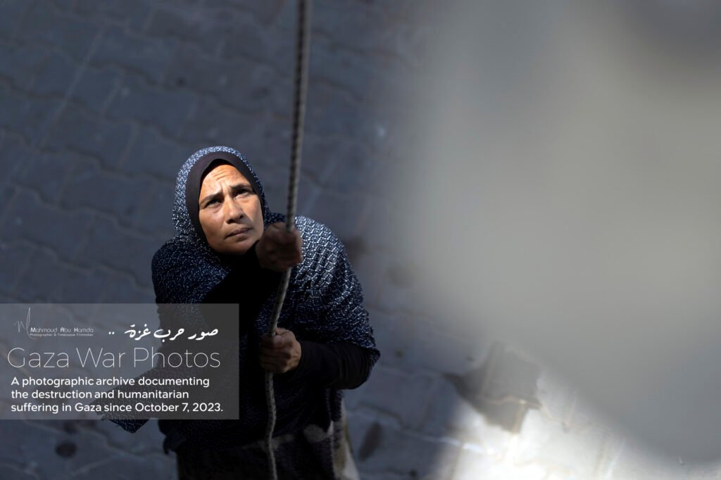 In the album “Struggle for Water”, we depict the daily struggle of Gazans in their search for clean water. Long lines form around distribution points, with children and women carrying containers while waiting for their turn to secure a drop of water. The sight of people searching for water amid destruction and temporary camps reflects the immense difficulties of daily life.