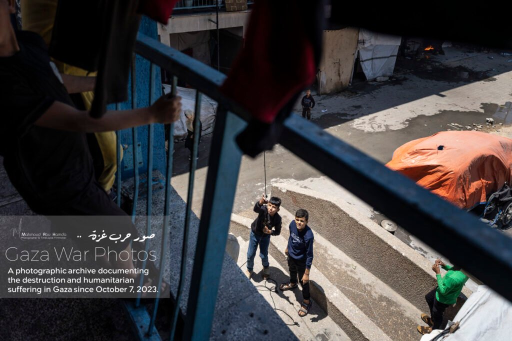 In the album “Struggle for Water”, we depict the daily struggle of Gazans in their search for clean water. Long lines form around distribution points, with children and women carrying containers while waiting for their turn to secure a drop of water. The sight of people searching for water amid destruction and temporary camps reflects the immense difficulties of daily life.