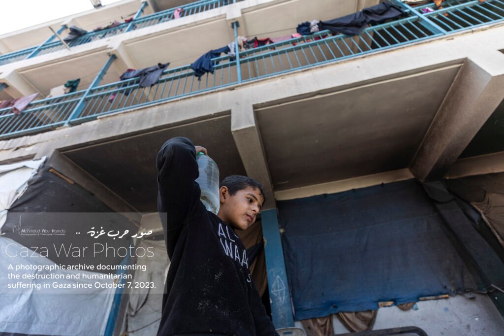 In the album “Struggle for Water”, we depict the daily struggle of Gazans in their search for clean water. Long lines form around distribution points, with children and women carrying containers while waiting for their turn to secure a drop of water. The sight of people searching for water amid destruction and temporary camps reflects the immense difficulties of daily life.