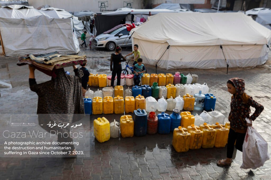 In the album “Struggle for Water”, we depict the daily struggle of Gazans in their search for clean water. Long lines form around distribution points, with children and women carrying containers while waiting for their turn to secure a drop of water. The sight of people searching for water amid destruction and temporary camps reflects the immense difficulties of daily life.
