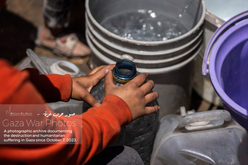In the album “Struggle for Water”, we depict the daily struggle of Gazans in their search for clean water. Long lines form around distribution points, with children and women carrying containers while waiting for their turn to secure a drop of water. The sight of people searching for water amid destruction and temporary camps reflects the immense difficulties of daily life.