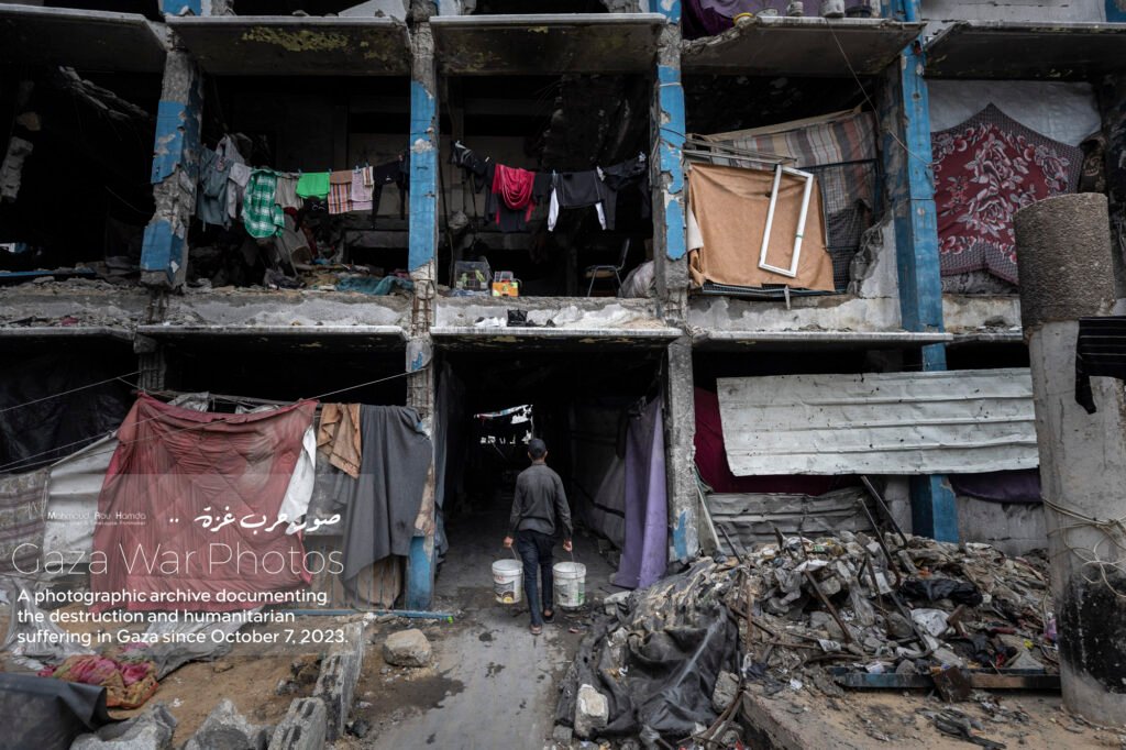 In the album “Struggle for Water”, we depict the daily struggle of Gazans in their search for clean water. Long lines form around distribution points, with children and women carrying containers while waiting for their turn to secure a drop of water. The sight of people searching for water amid destruction and temporary camps reflects the immense difficulties of daily life.